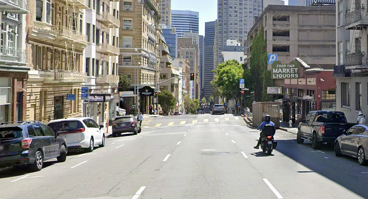 Then … The cabbie, asked to drive as fast as possible, complies by roaring through the city streets at breakneck speed. Here he crests California Street at Powell (incidentally, four blocks down the hill he will pass the bank where he picked up Herbert). Note the quaint signal booth on the corner at far right.
